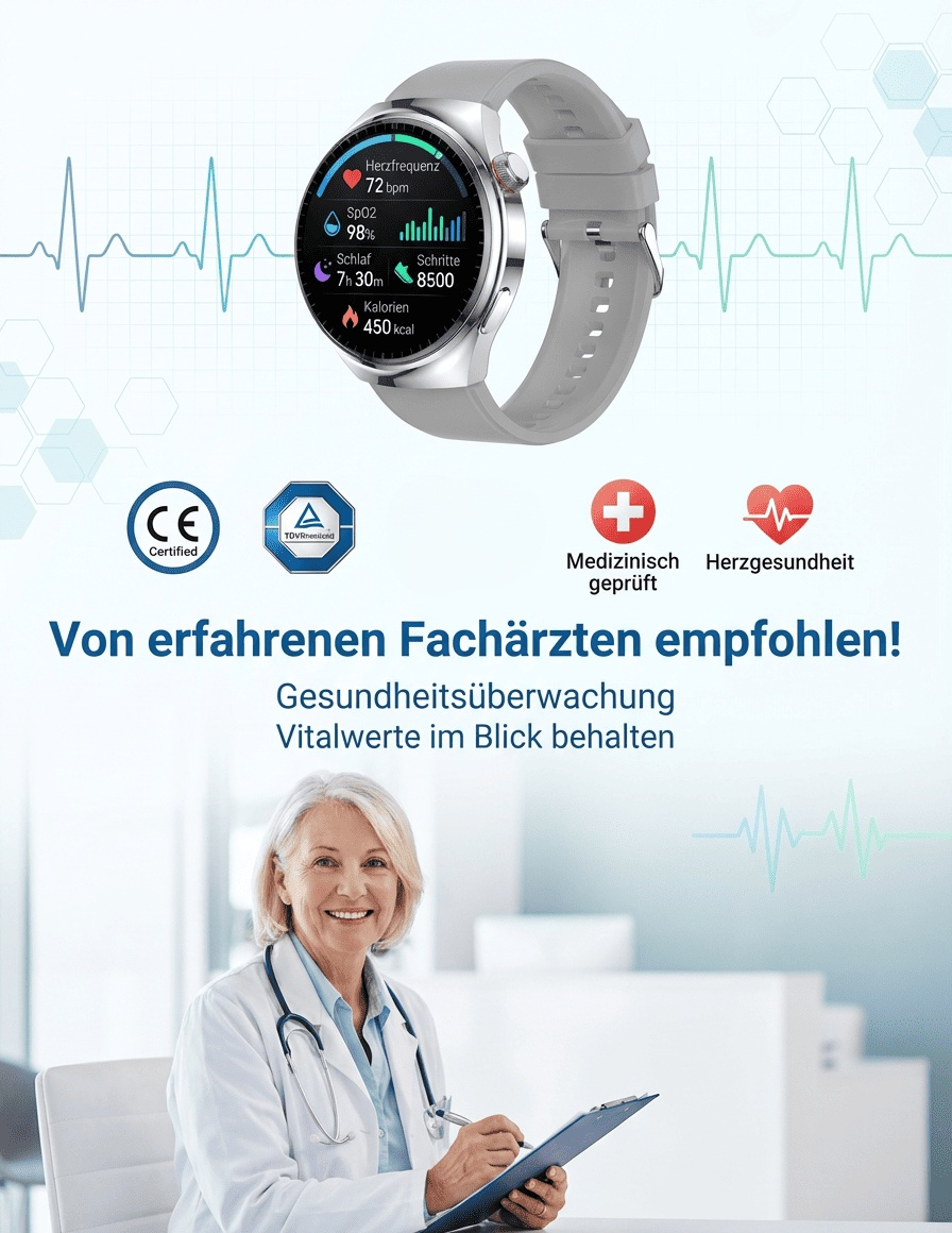 【Von Ärzten empfohlen】Lernen Sie die leistungsstärkste Smartwatch der Welt kennen. Die stärkste Smartwatch der Welt erfasst 24 Werte in 3 Sekunden – Blutzucker, Blutdruck, Puls, Temperatur. Silicon Valley und Ärzte tauschen 10.000‑Uhren gegen diese.